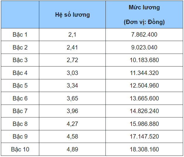 7. Bảng lương giáo viên trung học cơ sở, tiểu học, mầm non chính, các chức danh tương đương khác