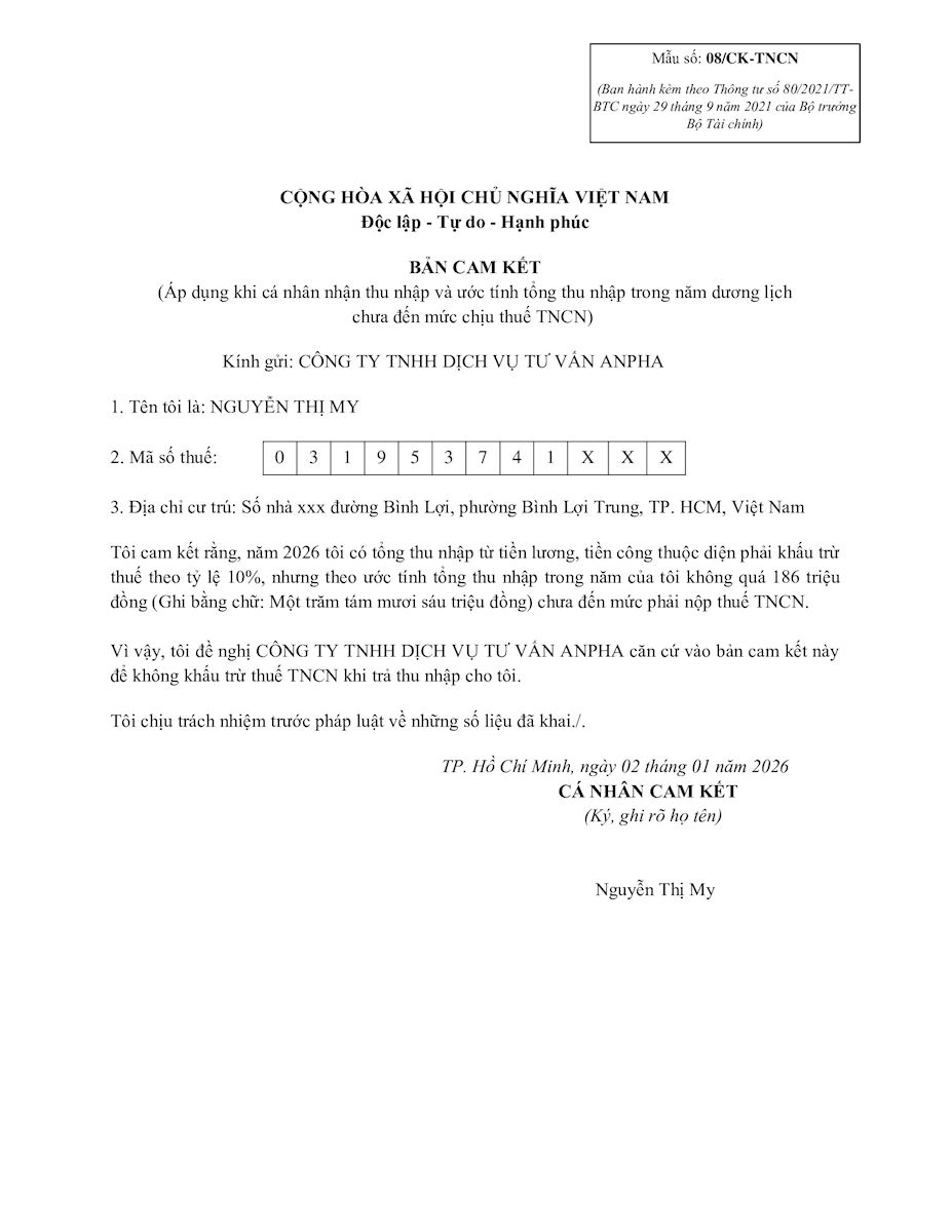 Bản cam kết TNCN mẫu 08/CK-TNCN - Ví dụ tham khảo