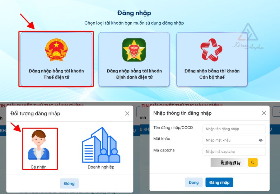 Bạn truy cập vào Cổng thông tin điện tử của Tổng cục Thuế ➞ Chọn “Đăng nhập” ➞ Chọn “Đăng nhập bằng tài khoản thuế điện tử” ➞ Chọn “Cá nhân” ➞ Nhập thông tin đăng nhập theo yêu cầu và nhấn nút “Đăng nhập”.