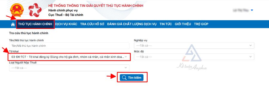 Sau khi đăng nhập thành công, màn hình sẽ thể hiện như hình bên dưới ➞ Chọn “Thủ tục hành chính” ➞ Tại mục “Tờ khai”, chọn “Tờ khai 03-ĐK-TCT - Tờ khai đăng ký (Dùng cho hộ gia đình, nhóm cá nhân, cá nhân kinh doanh) (TT86/2024)” ➞ Nhấn “Tìm kiếm”.