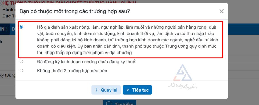Tiếp theo, tích chọn mục “Hộ gia đình sản xuất nông, lâm, ngư nghiệp, làm muối và những người bán hàng rong, quà vặt, buôn chuyến, kinh doanh lưu động, kinh doanh thời vụ, làm dịch vụ có thu nhập thấp không phải đăng ký hộ kinh doanh, trừ trường hợp kinh doanh các ngành nghề đầu tư kinh doanh có điều kiện. Ủy ban nhân dân tỉnh, thành phố trực thuộc Trung ương quy định mức thu nhập thấp áp dụng trên phạm vi địa phương”.
