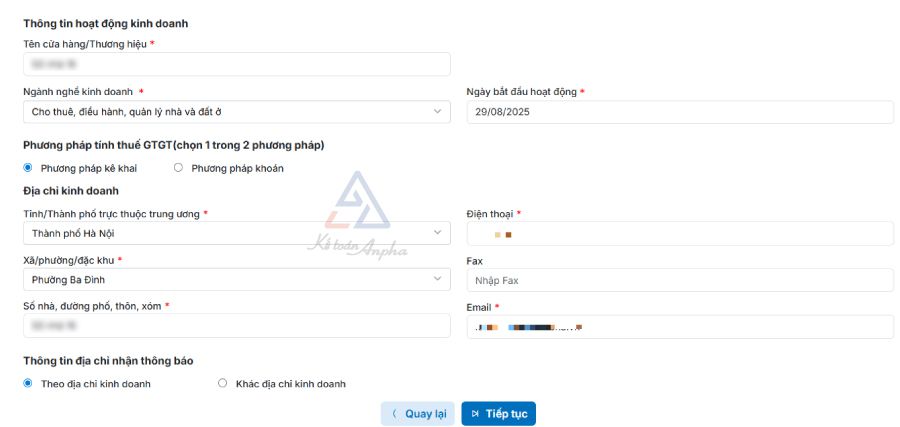 Khi màn hình hiện ra các thông tin bắt buộc về tài sản cho thuê, bạn tiếp tục nhập đầy đủ thông tin có dấu (*) và nhấn nút “Tiếp tục”. Ví dụ như ở hình dưới đây, Anpha đang nhập thông tin đăng ký cho tài sản cho thuê là nhà.