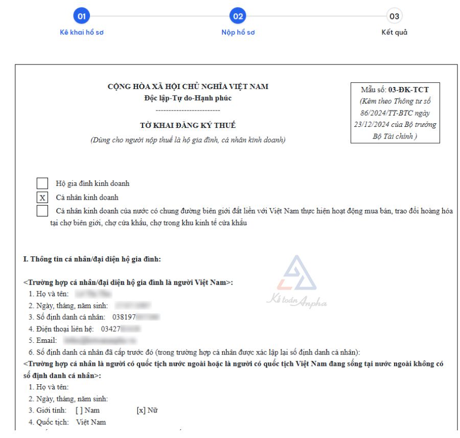 Theo quy định tại Điểm a Khoản 1 Điều 22 Thông tư 86/2024/TT-BTC, hồ sơ đăng ký mã số thuế của hộ kinh doanh, cá nhân kinh doanh gồm: