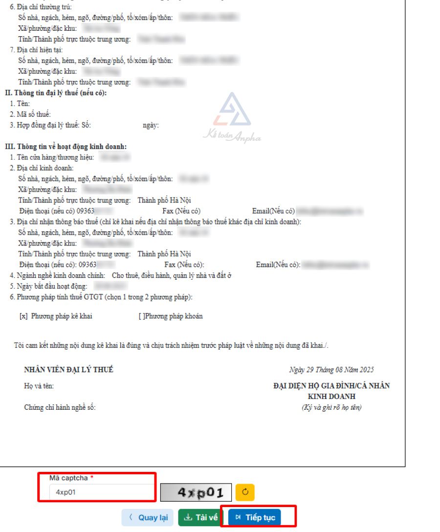 Lúc này, màn hình sẽ hiển thị tờ khai 03-ĐK-TCT, bạn kiểm tra lại toàn bộ thông tin, nhập mã capcha và nhấn nút “Tiếp tục”.