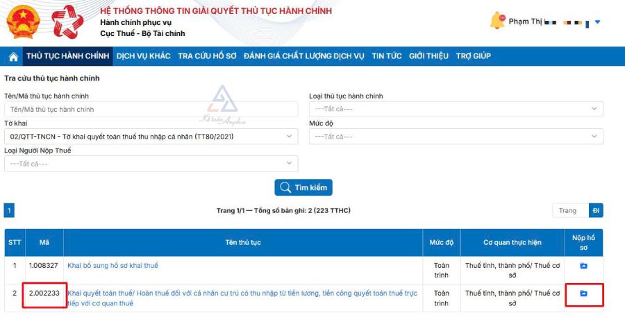 Tiếp đến, bạn chọn mẫu tờ khai có mã 2.002233 và nhấn vào nút nộp hồ sơ để tiến hành nộp hồ sơ.