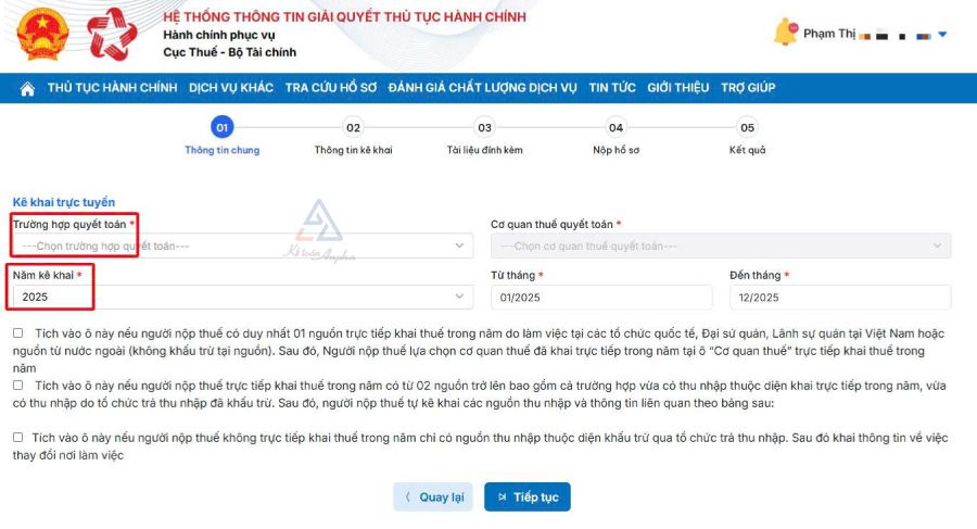 Tại giao diện hệ thống hiện ra, bạn chọn trường hợp quyết toán, năm kê khai và tích vào 1 trong 3 ô tương ứng với trường hợp của cá nhân mình.