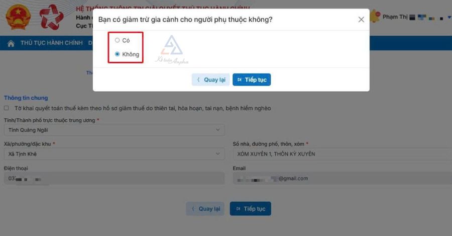 - Nếu thông tin trên tờ khai bị sai: Bạn nhấn “Quay lại” để thay đổi, điều chỉnh thông tin.