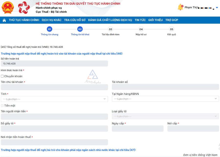 Sau đó, bạn tiến hành nhập thông tin số tài khoản ngân hàng nhận tiền hoàn thuế (cần ghi rõ tài khoản ngân hàng của bạn được mở ở chi nhánh nào).