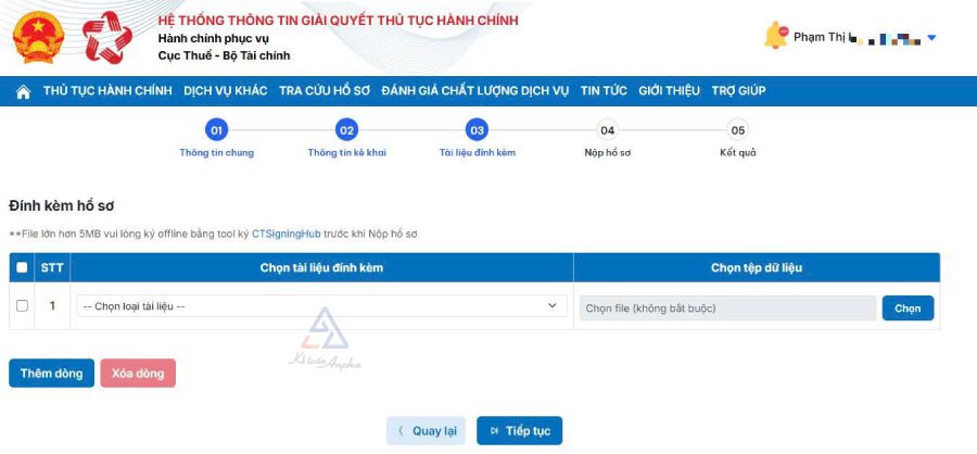 Sau khi hoàn thành việc đính kèm hồ sơ, bạn nhấn “Tiếp tục” để tới tab “Nộp hồ sơ”. Ở bước này, bạn cần kiểm tra lại các thông tin đã kê khai: