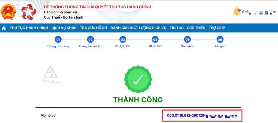Sau khi hoàn thành việc nhập mã OTP, hệ thống sẽ hiển thị thông báo nộp tờ khai thành công.