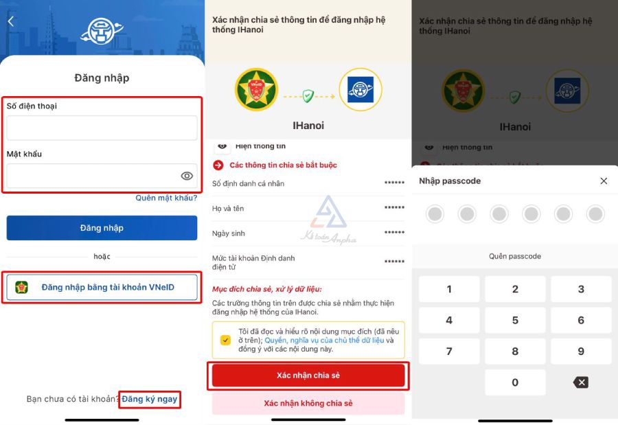 - Cách 2: Bấm “Đăng nhập bằng tài khoản VNeID” ➜ Tích chọn ô “Tôi đã đọc…” và bấm “Xác nhận chia sẻ” ➜ Nhập passcode.