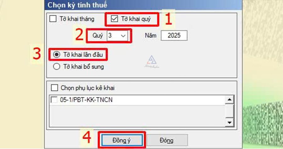 - Chọn quý và năm cần kê khai ví dụ: Quý 3, năm 2025.