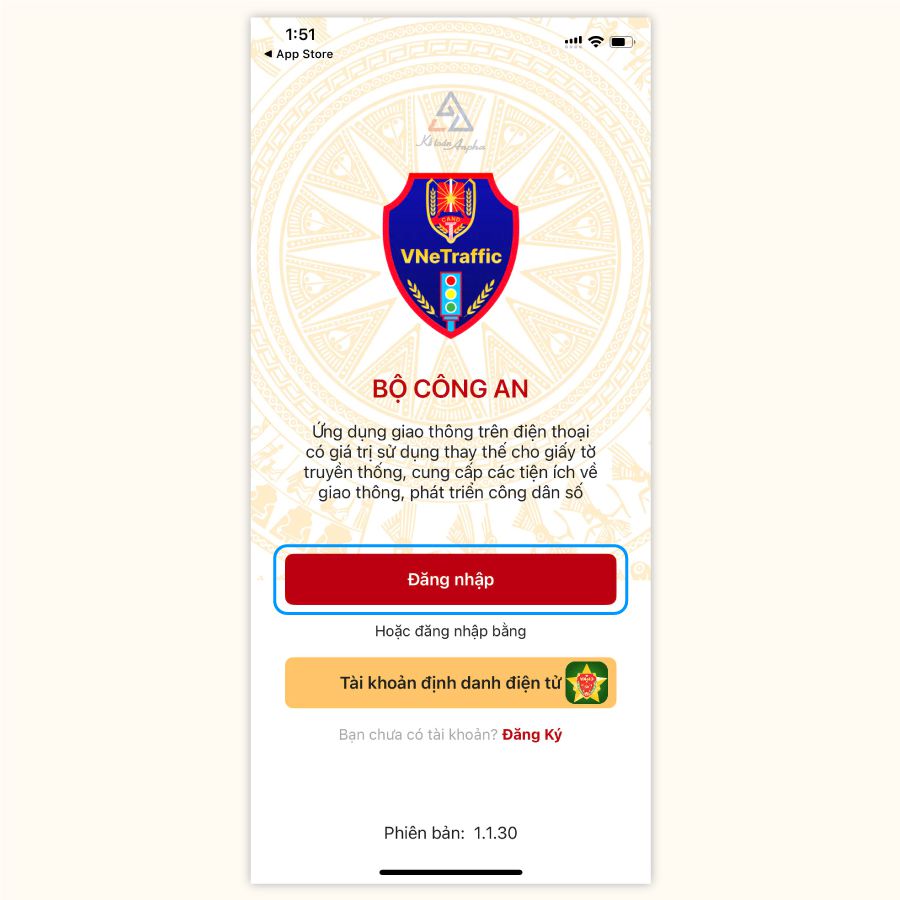 Bước 1: Công dân truy cập vào ứng dụng VNeTraffic và tiến hành đăng nhập tài khoản (mức 1).