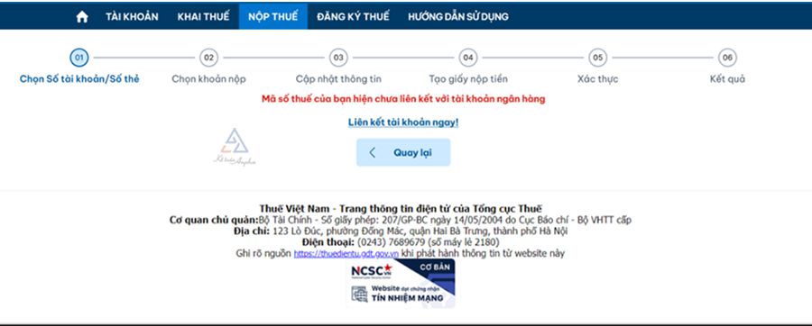 ➧ Truy cập vào danh mục “Nộp thuế” → Nhấn chọn “Liên kết tài khoản ngay!” để liên kết tài khoản ngân hàng.