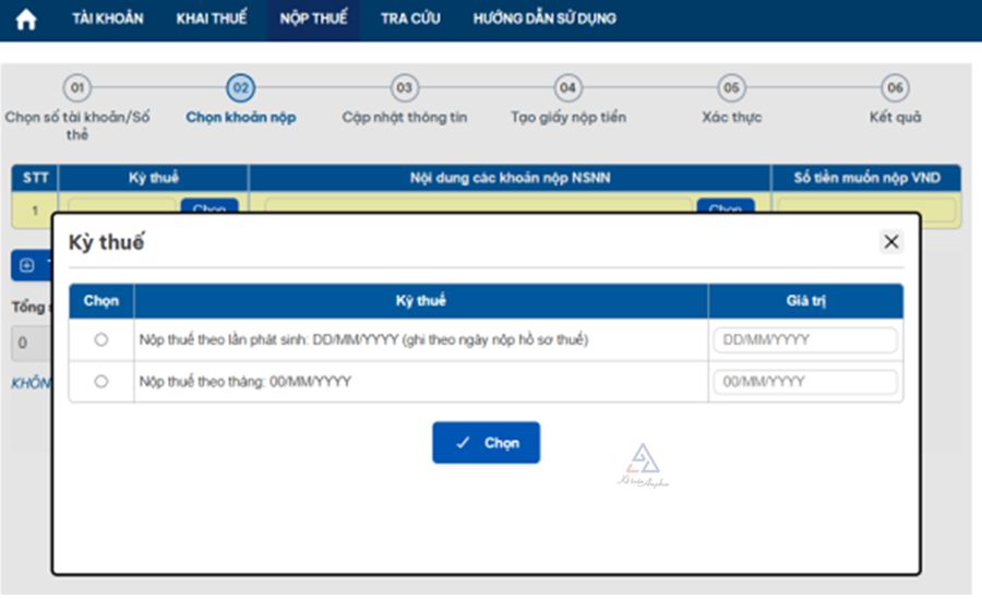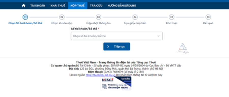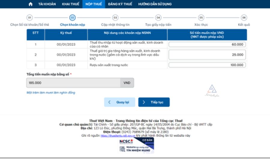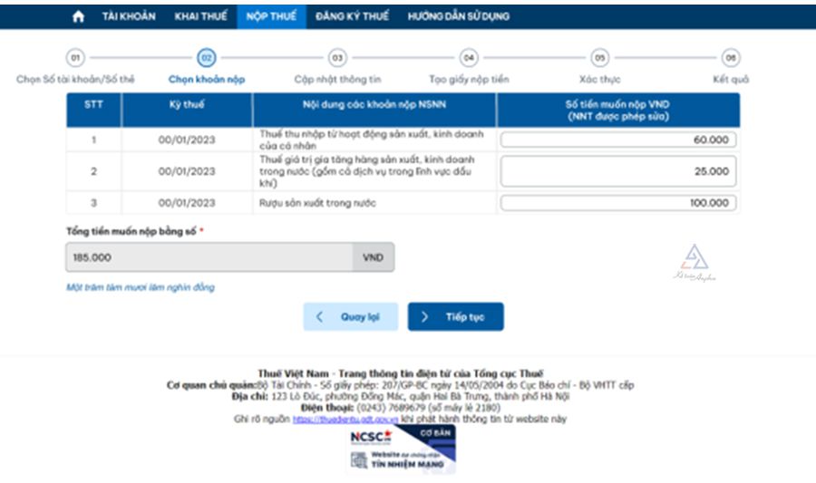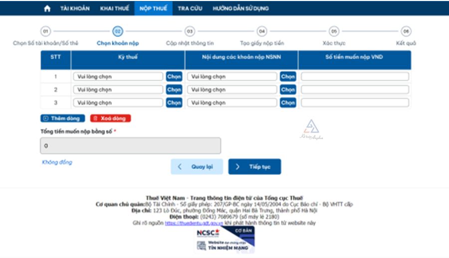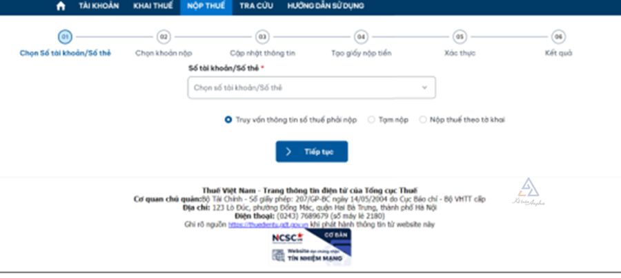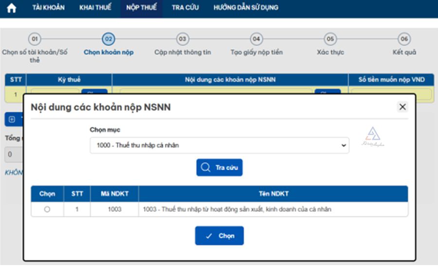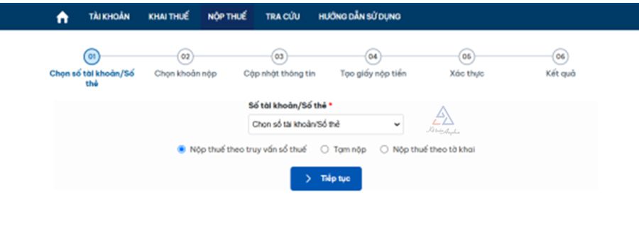Sau khi chọn xong, cá nhân nhấn vào ô “Tiếp tục”. Lúc này, giao diện nộp thuế sẽ chuyển sang giai đoạn 2 “Chọn khoản nộp”.