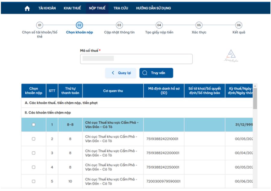 Giao diện lúc này sẽ được chuyển sang giai đoạn 2 “Chọn khoản nộp”, hệ thống sẽ hiển thị các thông tin bao gồm: