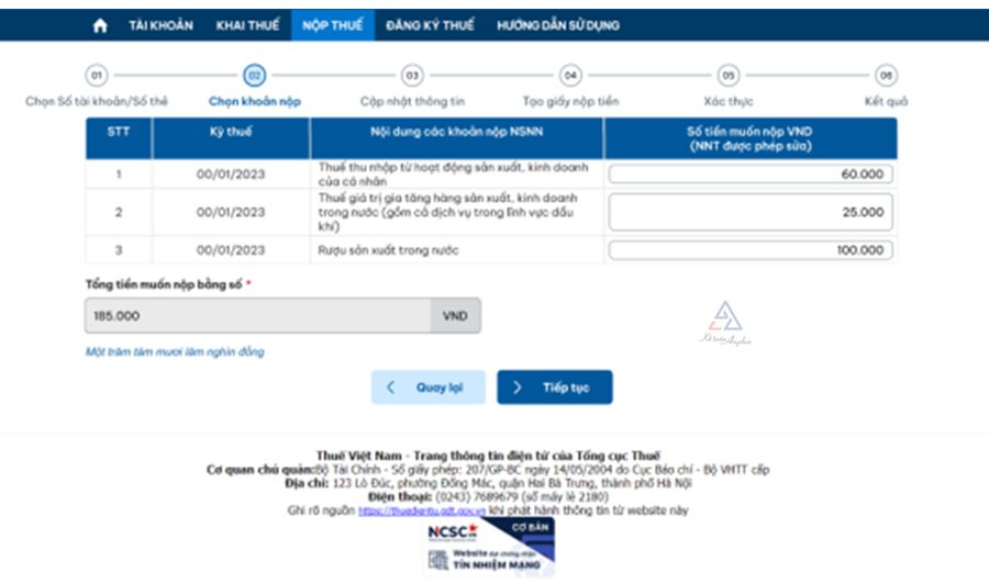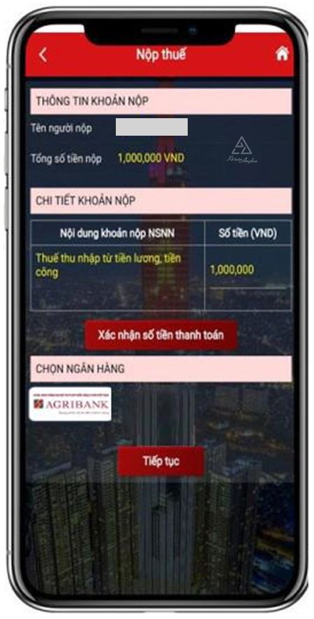 Sau khi cá nhân kiểm tra và điền hoàn tất → Nhấn vào ô “Tiếp tục”, màn hình sẽ hiển thị như ở bước 4 của cách nộp thuế tại danh mục “Nộp thuế” (lựa chọn 1), cá nhân thao tác các bước nộp thuế kế tiếp tương tự như Anpha đã hướng dẫn ở trên.