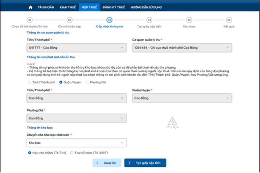 - Nhấn “Tạo giấy nộp tiền” để hệ thống chuyển sang mục tiếp theo;