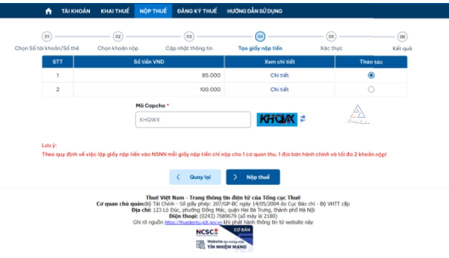 Sau khi chọn khoản tiền, cá nhân nhập mã theo yêu cầu hiển thị trên màn hình → Nhấn “Nộp thuế” để thực hiện tiếp thanh toán (nếu nhấn “Quay lại” thì hệ thống quay lại màn hình trước đó).