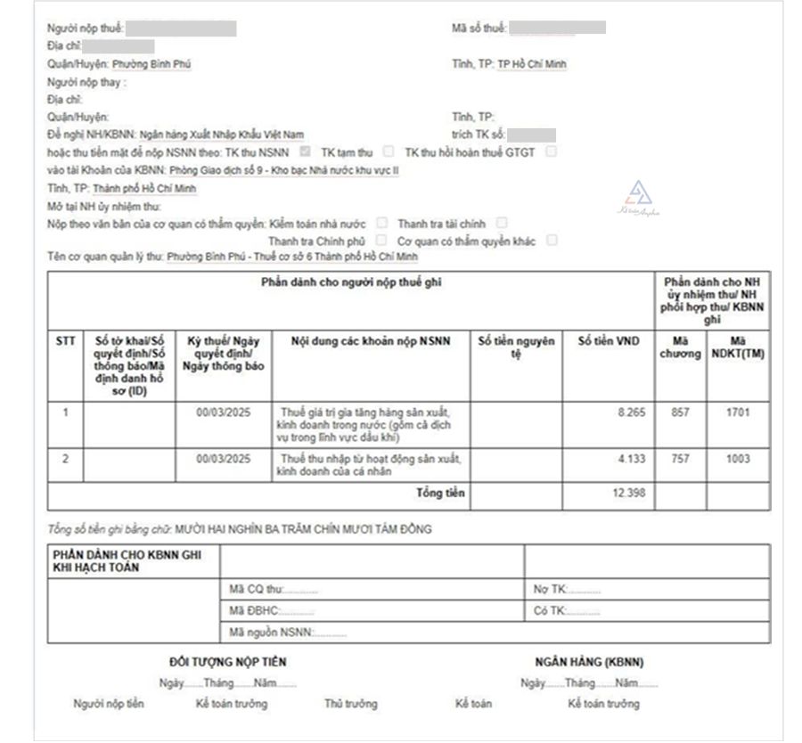 Cá nhân kiểm tra kỹ lại thông tin giấy nộp tiền, sau đó mang trực tiếp đến ngân hàng để nộp.
