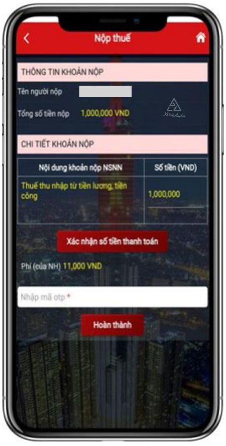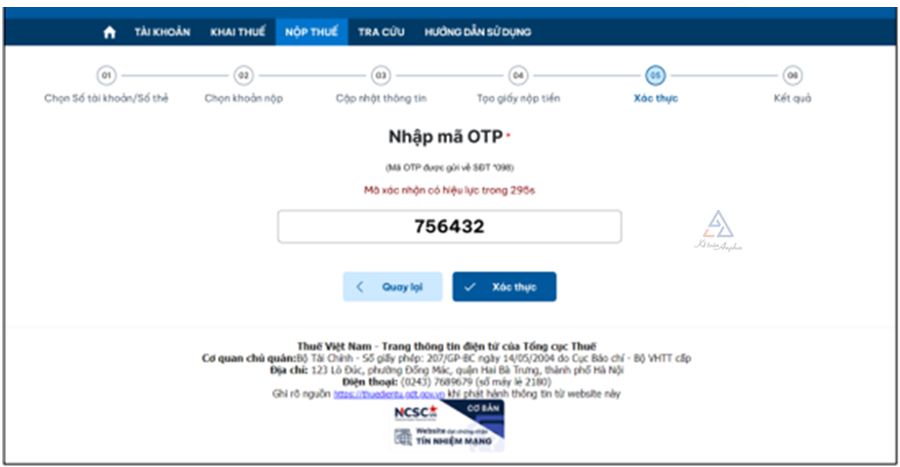 Sau khi hoàn tất và nhấn chọn “Nộp thuế” tại bước 5, hệ thống sẽ hiển thị màn hình nhập mã OTP để xác thực.