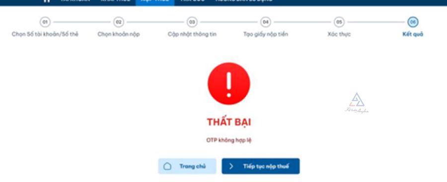 Trường hợp ngân hàng trả kết quả không hợp lệ thì hệ thống sẽ hiển thị màn hình nộp thuế thất bại.