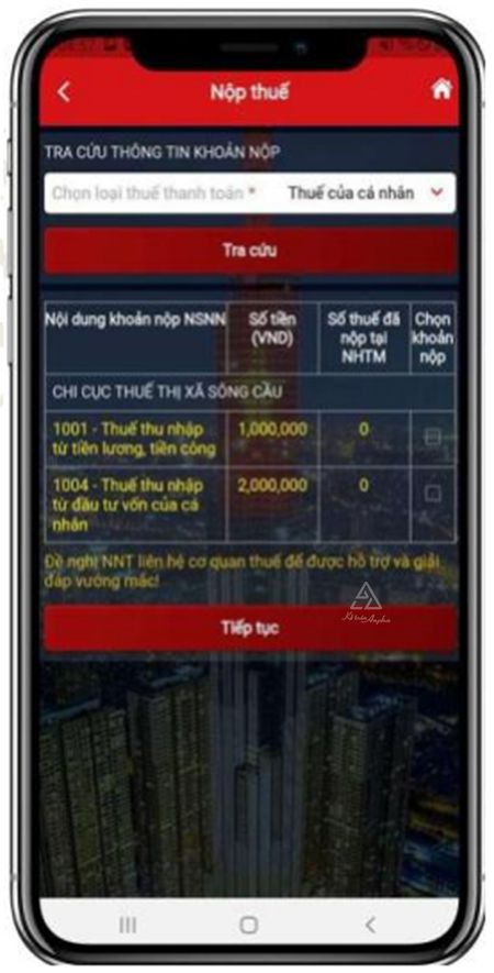 Tại màn hình hiển thị chi tiết khoản thuế phải nộp, cá nhân chọn 1 ngân hàng thanh toán (ngân hàng đã liên kết thành công trước đó) → Nhấn “Tiếp tục”.