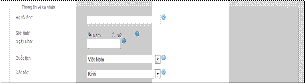 Các thông tin người dùng bắt buộc phải kê khai bao gồm: Họ và tên; Giới tính; Ngày sinh; Quốc tịch; Dân tộc; Địa chỉ liên hệ; Địa chỉ thường trú; Email; Điện thoại; Loại giấy tờ chứng thực cá nhân; Số giấy tờ chứng thực cá nhân; Ngày cấp; Nơi cấp.