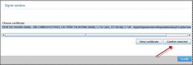 ·Nhấn nút [Xác nhận] ->Máy tính sẽ tự động chạy chương trình để nhận dạng chữ ký số công cộng và người nộp hồ sơ/người đăng ký sẽ chọn chữ ký số công cộng dùng để ký lên hồ sơ;