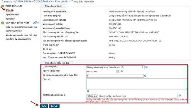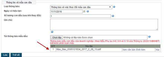 - Doanh nghiệp tải 01 file thông báo mẫu dấu. Trường hợp thông báo mẫu dấu của doanh nghiệp gồm nhiều trang, doanh nghiệp cần scan gộp thành 1 file pdf để tải lên Hệ thống. Hệ thống không hỗ trợ tải nhiều file thông báo mẫu dấu.