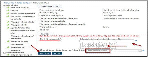- Nhập mã xác nhận hiển thị trên màn hình. Tên Phòng Đăng ký kinh doanh sẽ tiếp nhận hồ sơ được hiển thị bên dưới đoạn mã xác nhận và dưới dạng không chỉnh sửa được. Nếu hồ sơ vẫn còn thiếu thông tin theo quy định. Hệ thống sẽ hiển thị ̣cảnh báo đỏ. Người nộp hồ sơ/người đăng ký phải chỉnh sửa và chuẩn bị lại hồ sơ. Hệ thống tự động chọn Phòng Đăng ký kinh doanh để xử lý hồ sơ căn cứ vào tỉnh/thành phố của địa chỉ trự sở chính doanh nghiệp đăng nhập tại bước nhập thông tin.