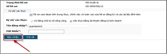 - Nếu hồ sơ đã đầy đủ thông tin theo quy định, nhập “chuỗi ký xác nhận” và nhấn nút [Xác nhận] để hoàn thành bước chuẩn bị hồ sơ.