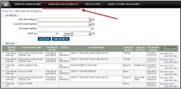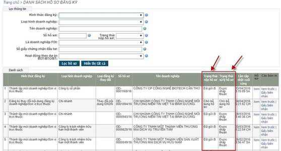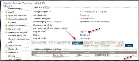 Người nộp hồ sơ/người đăng ký cũng có thể xem các văn bản liên quan đến hồ sơ: Giấy biên nhân hồ sơ nôp qua mạng; Thông báo yêu cầu bổ sung hồ sơ; Thông tin đầy đủ của hồ sơ nộp trên mạng và trạng thái nộp hồ sơ; trạng thái xử lý hồ sơ tương ứng với từng hồ sơ trong Danh sách hồ sơ đăng ký.