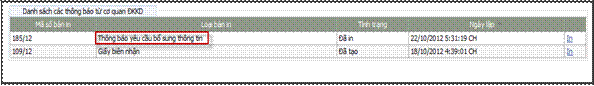 - Khi đăng nhập vào tài khoản của mình người nộp hồ sơ/người đăng ký, người nộp hồ sơ/người đăng ký có thể xem Thông báo yêu cầu bổ sung thông tincủa Phòng Đăng ký kinh doanh đối với hồ sơ đó (Hình 47: ).
