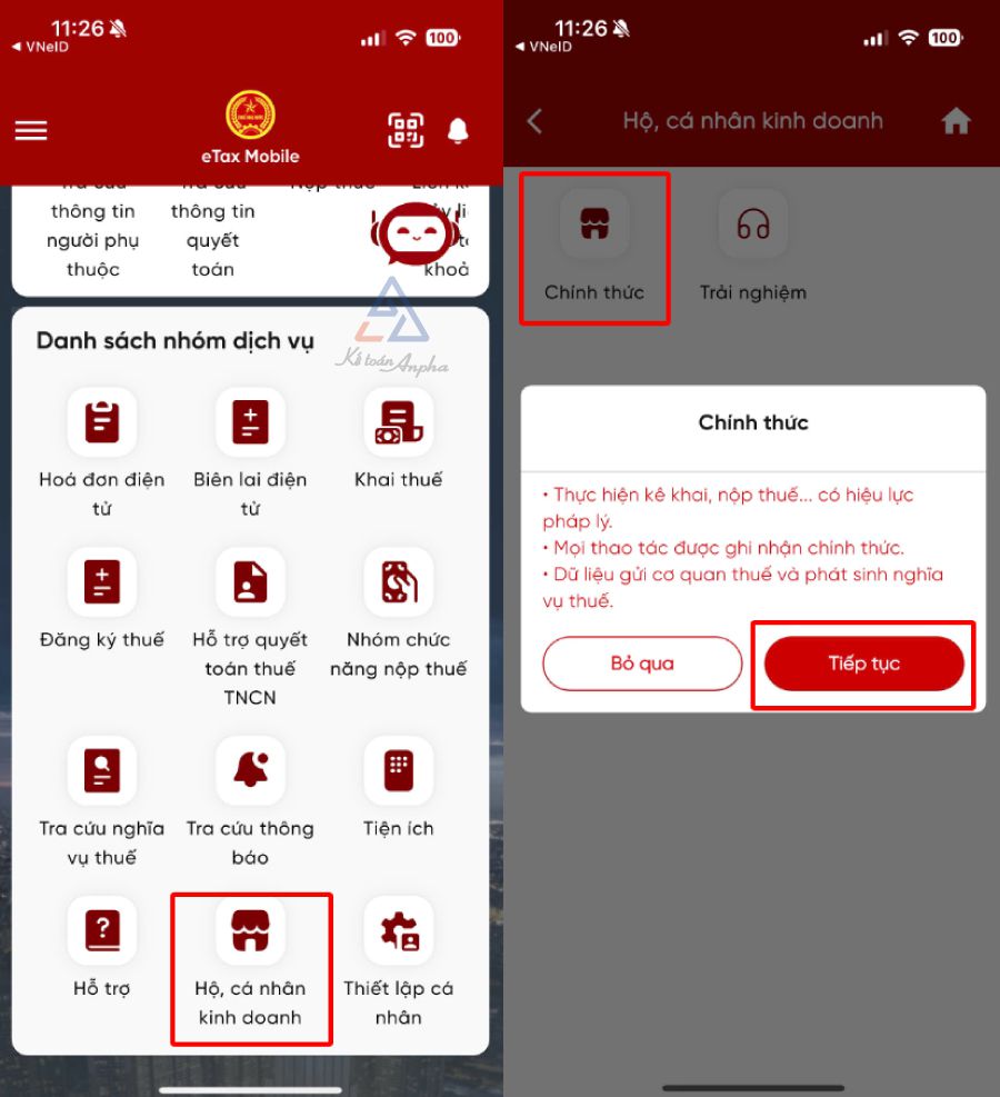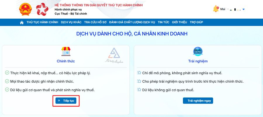 ➤ Bước 2: Tại mục “Danh sách nhóm dịch vụ” chọn “Hộ, cá nhân kinh doanh” ➜ chọn “Chính thức” và bấm “Tiếp tục”;