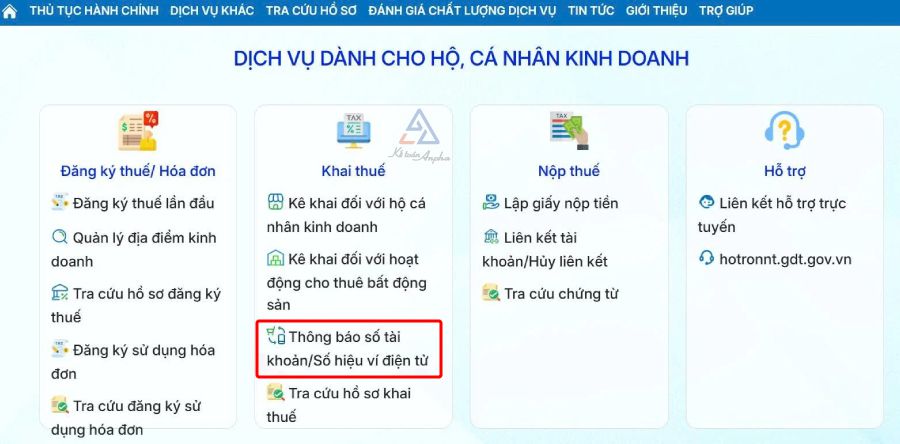 Để thực hiện đúng quy định, hộ kinh doanh cần thông báo số tài khoản ngân hàng và số hiệu ví điện tử trên Cổng dịch vụ công thuế nhà nước theo hướng dẫn sau đây: