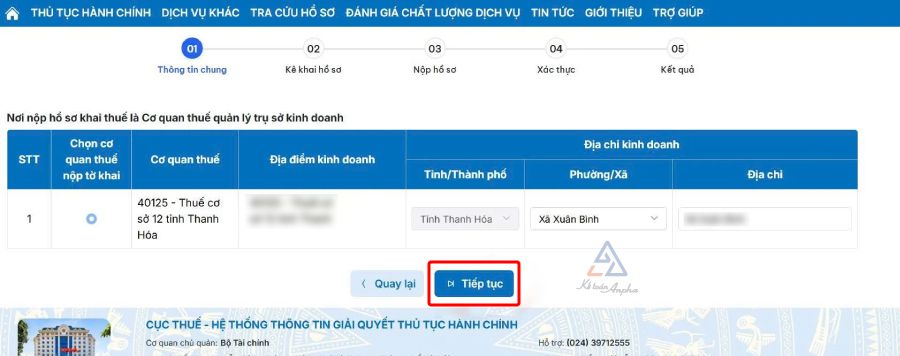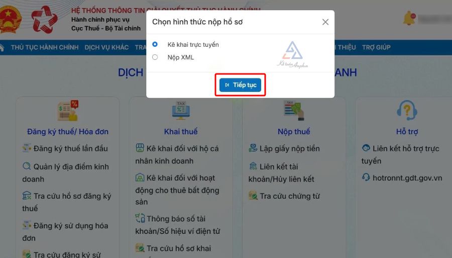 ➤ Bước 4: Tại đây bạn tích chọn “Kê khai trực tuyến” và bấm “Tiếp tục”;
