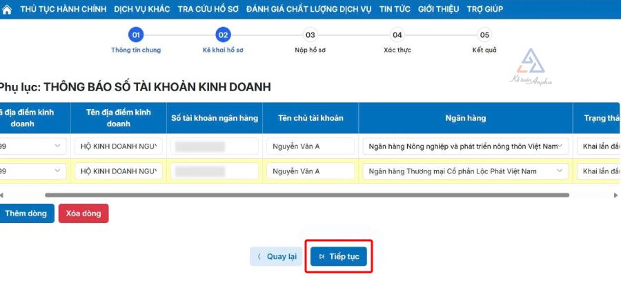 Trường hợp có nhiều tài khoản ngân hàng, bạn nhấp “Thêm dòng”, điền đầy đủ các thông tin trên, sau đó nhấn “Tiếp tục”.