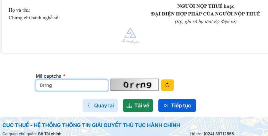 ➤ Bước 6: Tại đây màn hình hiển thị mẫu thông báo tài khoản điện tử, bạn kiểm tra lại thông tin sau đó nhập mã captcha và bấm “Tiếp tục”;