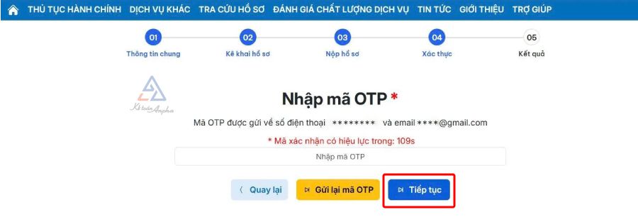 ➤ Bước 7: Hệ thống sẽ gửi mã OTP về điện thoại hoặc email bạn đã đăng ký với cơ quan thuế, bạn nhập lại mã OTP và bấm tiếp tục để hoàn tất khai báo số tài khoản ngân hàng của hộ kinh doanh.
