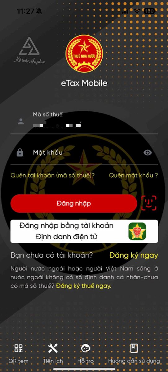 ➤ Bước 1: Đăng nhập eTax Mobile bằng tài khoản thuế điện tử hoặc tài khoản VNeID mức 2;