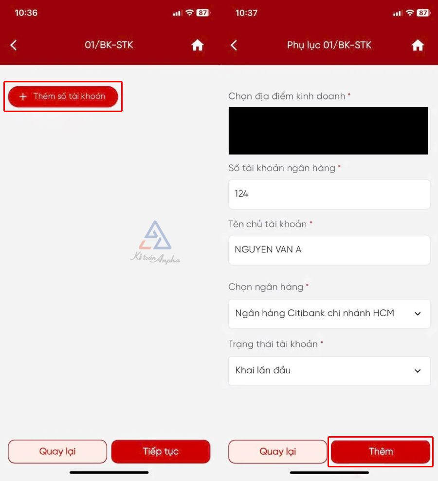 ➤ Bước 4: Chọn “Thêm số tài khoản” ➜ nhấn “Tiếp tục” ➜ nhập đầy đủ thông tin yêu cầu trên màn hình, sau đó nhấn “Thêm”;