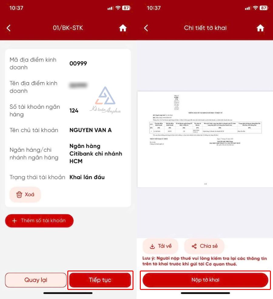 ➤ Bước 5: Kiểm tra lại thông tin đã kê khai ➜ nhấn “Tiếp tục” và nhấn “Nộp tờ khai” để hoàn tất thông báo số tài khoản với cơ quan thuế.