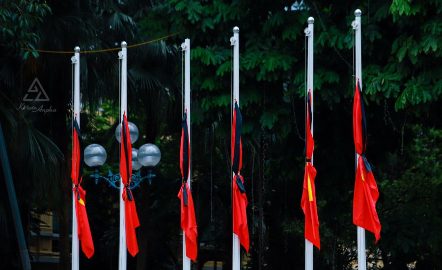 - Treo cờ đến 2/3 cột cờ và dùng băng vải đen để giữ cờ không bay;