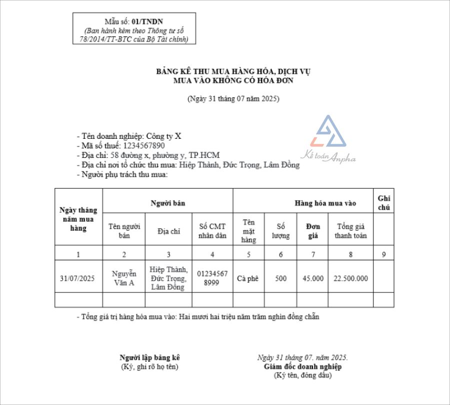 Ngày 31/07/2025, công ty X mua hạt cà phê chưa chế biến của Nguyễn Văn A với số lượng là 500kg giá 45.000 đồng/kg. Thông tin của công ty X và Nguyễn Văn A như sau: