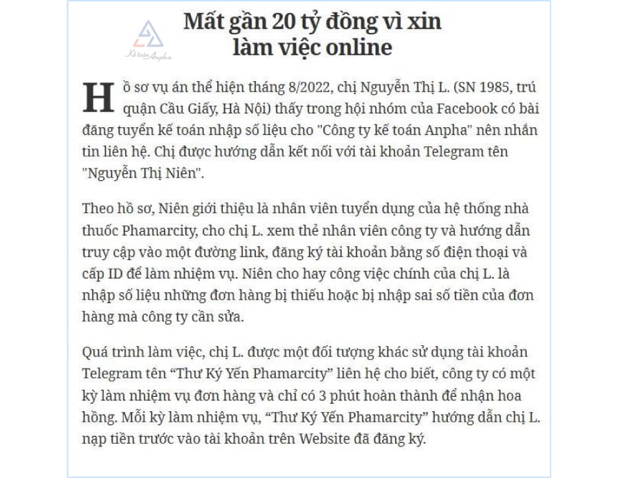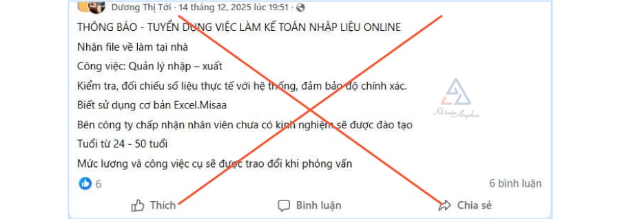 Cảnh báo mạo danh Kế toán Anpha để làm các chiêu lừa đảo tuyển dụng trên mạng, bẫy lừa đảo tuyển dụng việc làm (tuyển nhập liệu, tuyển kế toán tại nhà…)