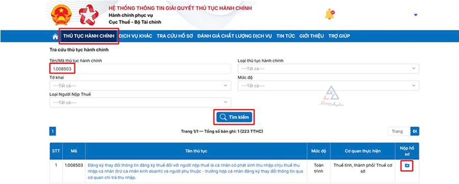 ➧ Vào chức năng “Thủ tục hành chính” ➜ Nhập "Mã thủ tục hành chính 1.008503” ➜ Ấn “Tìm kiếm” ➜ Chọn biểu tượng “Nộp hồ sơ”;