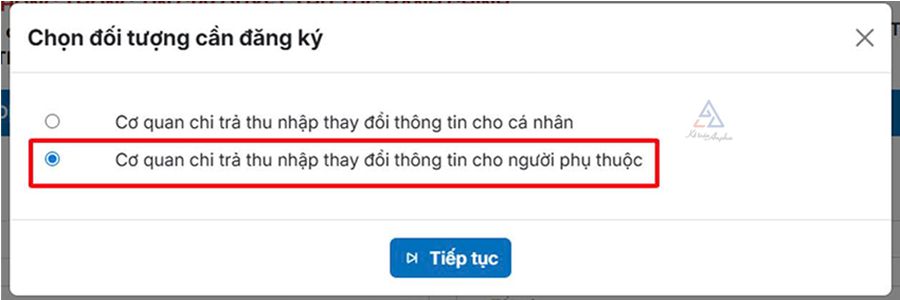 ➧ Chọn “Cơ quan chi trả thu nhập thay đổi thông tin cho người phụ thuộc” ➜ Ấn “Tiếp tục”.