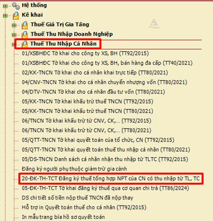 ➧ Chọn “Thuế Thu Nhập Cá Nhân” ➜ Chọn “20-ĐK-TH-TCT - Đăng ký thuế tổng hợp NPT của CN có thu nhập từ TL, TC”;