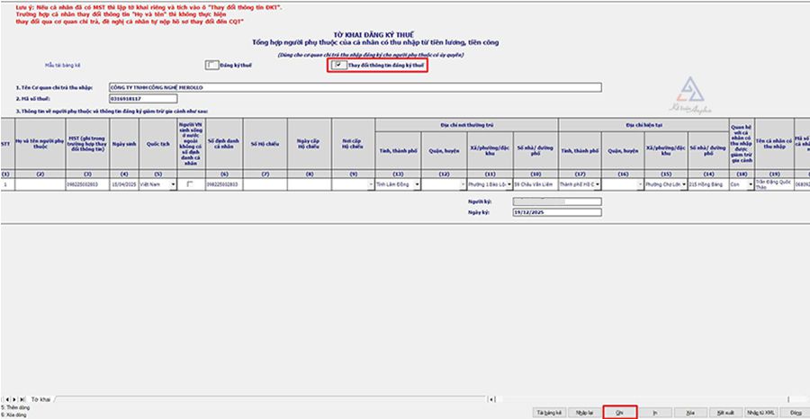 ➧ Tích chọn “Thay đổi thông tin đăng ký thuế” ➜ Nhập thông tin về người phụ thuộc ➜ Ấn “Ghi”;